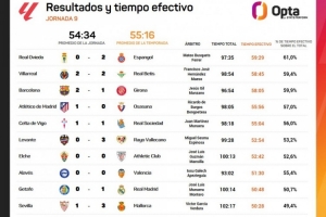 全文摘要:OPTA统计显示,西甲第九轮所有比赛的有效时间均未超过60分钟。各场实际比赛时间约97-102分钟,但有效时间普遍在50-59分钟之间,有效占比最低的甚至不到50%,反映出比赛中存在大量停顿。