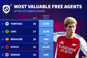 全文摘要:德转更新自由球员身价榜,富安健洋以1600万欧居首。洛迪(1200万欧)、雷吉隆(500万欧)、齐耶赫(350万欧)等球员也位列前十。该榜单还公布了自由球员最贵阵,富安健洋与洛迪领衔后防线,齐耶赫为中场最高身价球员。