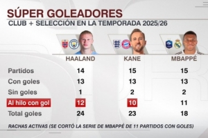 全文摘要:ESPN对比了哈兰德、凯恩、姆巴佩的赛季数据。哈兰德14场轰24球,连续12场破门;凯恩15场进23球,连续10场破门;姆巴佩15场进18球。哈兰德进球效率暂居三人之首。
