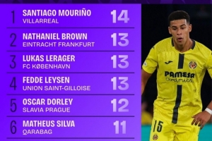 全文摘要:欧冠联赛阶段三轮战罢,铲球榜公布。比利亚雷亚尔后卫圣地亚哥-穆里尼奥以14次铲球位列榜首,法兰克福的布朗等三人13次并列第二。