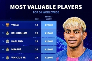足坛球员身价最新榜单出炉,亚马尔以2亿欧元的身价高居榜首,贝林厄姆、哈兰德、姆巴佩则以1.8亿欧元并列第二。