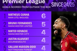 全文摘要:曼联球星库尼亚在对阵布莱顿的比赛中远射破门,帮助球队4-2取胜。据统计,他已成为自上赛季以来英超禁区外进球最多的球员,共有6球,力压队友布鲁诺·费尔南德斯的5球,位居该项数据榜首。
