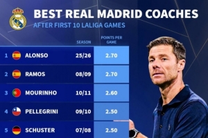 全文摘要:皇马主帅阿隆索执教前10轮西甲表现惊艳,场均2.70分,与拉莫斯并列历史第一。他带队在2-1战胜巴萨的焦点战后,延续了出色的开局战绩,展现了卓越的执教能力。