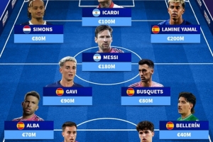 全文摘要:德国转会市场统计了巴萨青训球员的历史最高身价阵容。该阵容由亚马尔(2亿欧)和梅西(1.8亿欧)领衔,总价值达9.9亿欧。加维、伊卡尔迪、奥纳纳等名将也在列,展现了巴萨青训营的雄厚实力。