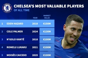 全文摘要:切尔西名宿阿扎尔入选英超名人堂,并仍保持着队史最高德转身价纪录(1.5亿欧元)。科尔-帕尔默以1.3亿欧元的身价位居第二,坎特、卢卡库和凯塞多并列第三,均为1亿欧元。