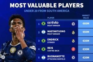 全文摘要:《转会市场》最新统计显示,切尔西新星埃斯特旺以6000万欧元领跑南美U20球员身价榜。皇马的马斯坦托诺(5000万)和恩德里克(3500万)分列二、三位,赫罗纳的雷斯以3000万欧元位列第四。该榜单聚焦南美青年才俊,切尔西与皇马各有两人上榜,凸显两队在发掘南美 talent 上的优势。