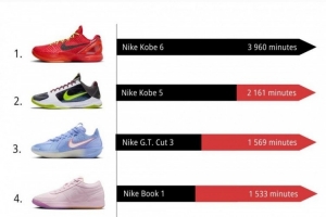 全文摘要:11月NBA新赛季十月份球鞋上脚排行出炉。科比系列强势包揽前三,其中Nike Kobe 6以3960分钟登顶,Nike Kobe 5和Nike Kobe 4分列第二、第五。Nike G.T. Cut 3和Book 1紧随其后,其他热门鞋款如KD 18、Harden Vol. 9等也进入前十。