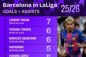 全文摘要:巴萨本赛季五大联赛首队,5名球员联赛参与进球超5人。亚马尔(7)、费兰(6)、拉什福德(6)、拉菲尼亚(5)和费尔明(5)领衔,进攻多点开花,展现强大火力。