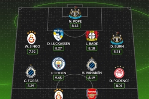 全文摘要:WhoScored公布欧冠本周最佳阵容。门将由纽卡的波普担任。后卫线包括辛格、卢卡森、巴代和丹-伯恩。中场有博尔赫斯、福登、瓦纳肯和波登斯,锋线则由奥斯梅恩和梅里诺领衔。