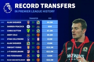 全文摘要:英超历史转会费纪录不断刷新。从1992年希勒的450万欧,到如今伊萨克以1.45亿欧加盟利物浦成为标王。纪录随足坛发展水涨船高,反映了足球商业价值的巨大变迁。