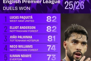 英超本赛季成功对抗榜:帕奎塔、安德森、帕利尼亚位列前三