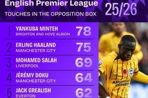 全文摘要:英超11轮战罢,据squakwa统计,布莱顿前锋明特以78次在对方禁区内触球次数高居榜首,力压曼城前锋哈兰德(75次)。萨拉赫、多库等知名攻击手也跻身榜单前列。