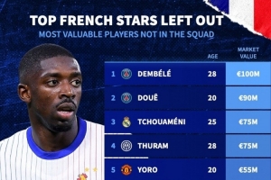 全文摘要:德国转会市场统计了无缘本期法国队球员的身价,登贝莱以1亿欧高居榜首。杜埃(9000万欧)、琼阿梅尼与图拉姆(均7500万欧)紧随其后。约罗(5500万欧)及多名身价3500万欧的球员也位列榜单,展示了法国人才储备的雄厚。