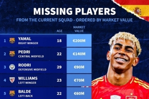 西班牙队球员身价更新:亚马尔以2亿欧位列第一,佩德里1.4亿欧紧随其后。