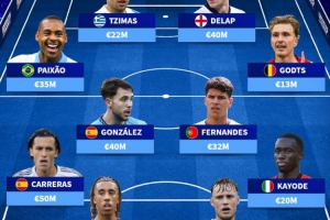 全文摘要:《转会市场》统计了从未被国家队征召的年轻球员,并排出了一套总身价3.6亿欧元的阵容。该阵中包含了多位豪门新星,如法国后卫约罗、巴西中场派尚和英格兰前锋德拉普等,他们尽管在俱乐部表现出色,却仍未获得各自国家队的召唤。