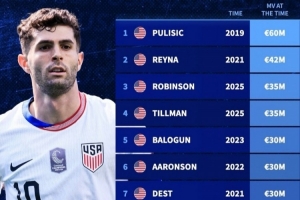 德转统计美国球员历史身价:2019年普利西奇以6000万欧元位列榜首
