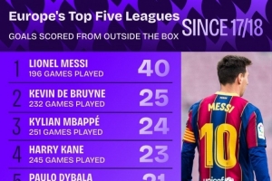 全文摘要:Squawka统计显示,自17-18赛季以来,五大联赛禁区外远射进球榜中,梅西以196场40球高居榜首,德布劳内(232场25球)和姆巴佩(251场24球)分列二、三位。该榜单凸显了顶级球员在禁区外的得分能力。