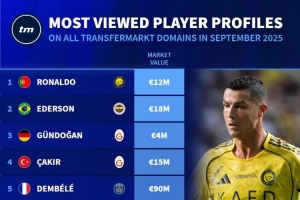 全文摘要:德国转会市场公布9月球员与俱乐部页面浏览量排名。球员榜中,C罗高居榜首,埃德森、京多安分列二、三位,梅西位列第七。俱乐部榜方面,土耳其球队费内巴切和加拉塔萨雷包揽前两名,英超豪门利物浦、巴萨、曼联等传统强队紧随其后。