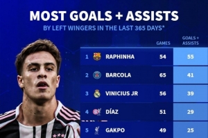 全文摘要:德国转会市场统计五大联赛左边锋近一年参与进球数,拉菲尼亚以54场55球高居榜首。伊尔迪兹52场24球排名第6,其德转身价将于明日更新。