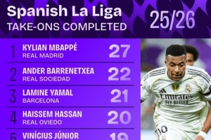 全文摘要:根据Squawka统计,姆巴佩以27次过人领跑本赛季西甲过人榜。皇家社会新星巴雷内切亚以22次位居次席,巴萨天才亚马尔则以21次排名第三。皇马双星维尼修斯和姆巴佩在前五中占据两席。