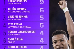全文摘要:根据Squawka统计,本赛季西甲射手榜上,皇马前锋姆巴佩以9球高居榜首。马竞的阿尔瓦雷斯以6球位列第二,皇马的维尼修斯与艾永同以5球并列第三。莱万的巴萨队友费兰-托雷斯等五名球员均打入4球,共同排在第五位。