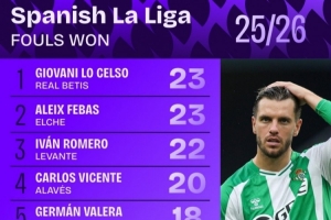 全文摘要:Squawka统计显示,本赛季西甲被犯规次数排行出炉。贝蒂斯洛塞尔索以23次居首,费巴斯并列。埃尔切、莱万特、阿拉维斯等队球员紧随其后。马竞小将朱利亚诺-西蒙尼以18次与多人并列第五,遭遇对手重点“照顾”。