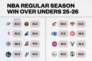 全文摘要:博彩公司BetMGM公布NBA新赛季常规赛胜场预测,雷霆以62.5场高居榜首,被看好战绩最佳。掘金(53.5场)、火箭(52.5场)紧随其后,骑士则以56.5场位列东部第一。数据反映了各队新赛季的夺冠前景预期。