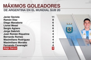 全文摘要:ESPN统计了阿根廷球员在世青赛的射手榜。萨维奥拉以11球断层领先,马拉多纳、梅西和阿圭罗均以6球并列次席,萨尔科本届赛事打入4球也跻身榜单。