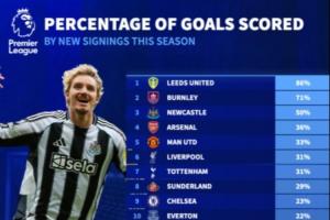全文摘要:英超新赛季7轮后,德国转会市场统计了各队新援进球占比。利兹联以86%高居榜首,阿森纳(36%)、曼联(33%)和利物浦(31%)分列4至6位。水晶宫和富勒姆的新援则尚未取得进球。