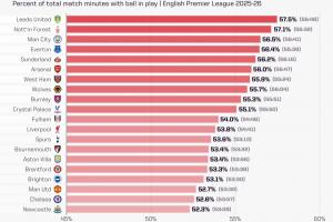 全文摘要:OPTA统计显示,本赛季英超净比赛时间占比中,利兹联以57.5%居首。纽卡、切尔西、曼联则位列倒数三位,占比分别为52.3%、52.6%和52.7%。数据反映了各队比赛节奏的差异。