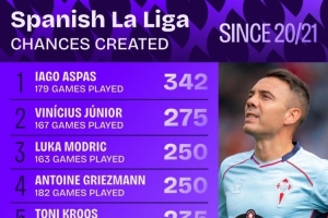 全文摘要:根据Squawka统计,自20-21赛季以来,阿斯帕斯以342次创造机会次数高居西甲榜首。维尼修斯以275次位列第二,莫德里奇与格列兹曼同以250次并列第三。该榜单展示了近几个赛季在西甲联赛中为队友创造得分机会最多的球员。