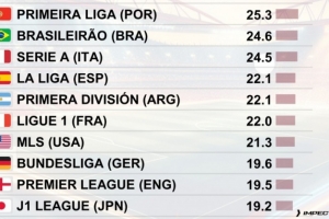 全文摘要:根据CIES足球天文台统计,葡超以每场25.3次犯规高居全球联赛榜首,犯规数最多。巴甲、意甲分列二、三位。德甲、英超和J联赛则以较低的犯规数,分列榜单末尾。