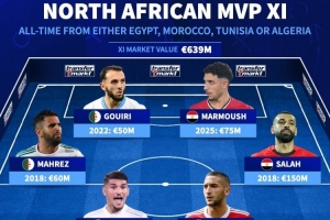 全文摘要:德国转会市场列出了北非国家历史身价最高阵容。埃及的萨拉赫以1.5亿欧身价领衔,摩洛哥的阿什拉夫(8000万欧)和阿尔及利亚的马赫雷斯(6000万欧)在列。该阵容由埃及、摩洛哥、阿尔及利亚等国球星组成,展现了北非足坛的顶尖实力。