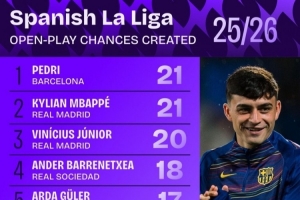 全文摘要:Squawka统计了本赛季西甲运动战创造机会排行。佩德里与姆巴佩以21次并列第一,维尼修斯以20次紧随其后。皇马球员占据榜单前列,包揽前三中的两席,展现了强大的进攻创造力。