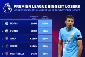 全文摘要:德转更新英超球员身价,罗德里与福登并列跌幅榜第一,均下降2000万欧,现价分别为9000万与8000万欧。萨卡、维尔茨等7名球员身价下跌1000万欧,奥纳纳等3人下跌700万欧。